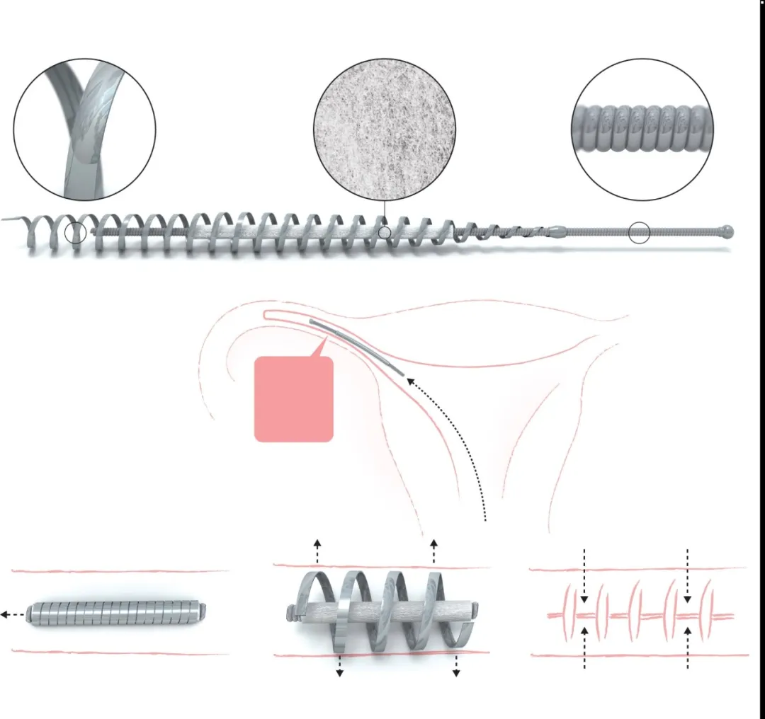 纤维填充:PET(聚对苯二甲酸乙二醇酯)纤维夹在螺旋间隙,诱发局部纤维化,数周至数月内形成瘢痕,永久堵塞输卵管。