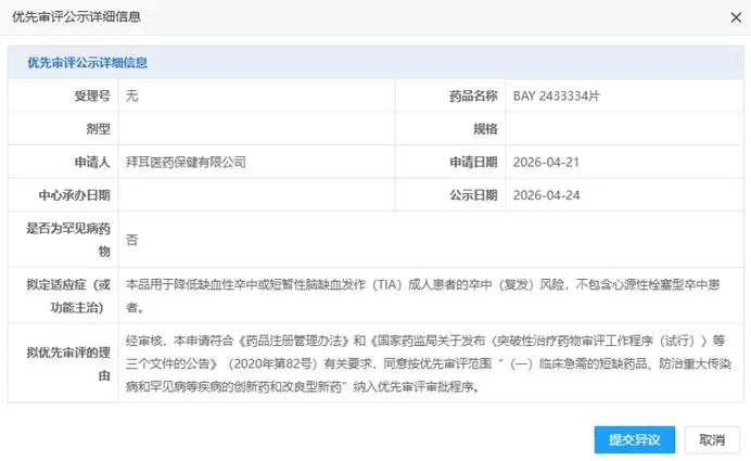 数据显示,BAY 2433334于2019年11月首次向CDE提交临床试验申请,2020年顺利获批临床并快速推进至II期,2023年进入III期临床试验,聚焦缺血性卒中及血栓栓塞相关适应症。其中国上市申请依托于全球关键III期研究OCEANIC-STROKE的积极结果,该研究为大规模、随机、双盲、安慰剂对照试验,全球入组超12300名患者,旨在评估BAY 2433334联合抗血小板治疗,在预防非心源性缺血性卒中或高危TIA患者卒中复发方面的疗效与安全性,最终顺利达到主要疗效和安全性终点,为其上市提供了坚实的临床证据。此次被CDE拟纳入优先审评,将大幅缩短其上市周期,有望快速惠及国内卒中高负担人群。