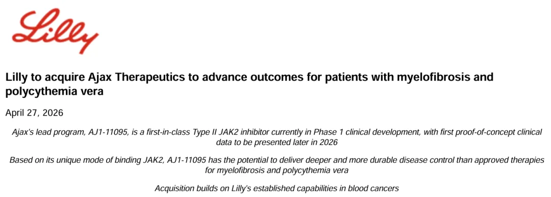 4月27日,礼来宣布以23亿美元收购Ajax Therapeutics,一家为骨髓增生性肿瘤(MPN)患者开发下一代JAK抑制剂的生物制药公司。Ajax的主要资产AJ1-11095是一种研究性的、每日口服一次的II型JAK2抑制剂,目前正在一项1期临床试验AJX-101中评估,该试验针对的是之前接受过I型JAK2抑制剂治疗的骨髓纤维化患者。Ajax股东将获得高达23亿美元的现金,包括预付款和在达到某些临床和监管里程碑后的后续付款。