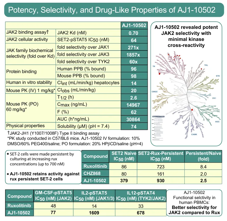 所有批准用于MPN患者的JAK2抑制剂,包括骨髓纤维化和真性红细胞增多症,都与JAK2的I型确认结合,如如诺华/Incyte的Jakavi(ruxolitinib)以及百时美施贵宝的Inrebic(Fedratinib)。虽然这些JAK2抑制剂提供了临床和症状缓解,但许多患者由于缺乏持久益处或反应丧失而经常停止I型JAK2治疗。AJ1-11095被设计为一种选择性II型JAK2抑制剂,不仅比现有的JAK2抑制剂具有更深入、更持久的疗效,而且为那些对I型JAK2抑制产生耐药性的患者提供了一种新的治疗选择。AJ1-11095的1期临床试验于2024年底开始,预计2026年将进行未来临床开发的剂量选择。