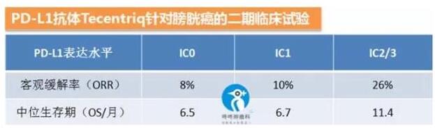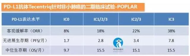 值得注意的是:这个临床结果发现无论PD-L1表达状态如何,使用Tecentriq都会比使用多西他赛的患者OS更长。之前就有Tecentriq针对非小肺癌的二期临床POPLAR 研究,发现PD-L1表达量越高,Tecentriq的效果越好。IC0代表PD-L1阴性,IC1/2/3代表PD-L1阳性,IC3是强阳性。具体的临床数据如下: