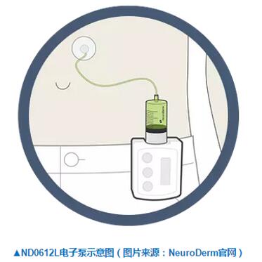 NeuroDerm公司的ND0612L就是为了解决这一问题的左旋多巴/卡比多巴配方。ND0612L是一种液体的左旋多巴/卡比多巴配方。它可以通过别在腰带上的一个小巧的电子泵24小时持续以小剂量皮下注射的方式注入体内。这种方式可以将血液中左旋多巴的水平保持在一个相对稳定的浓度,从而防止由于左旋多巴过高或过低导致的异动症和“关闭”状态。这种通过电子泵持续注射药物的治疗方法在其它疾病中已经有过先例,比如糖尿病患者就可以通过电子泵持续注射小剂量的胰岛素来控制血糖水平。
