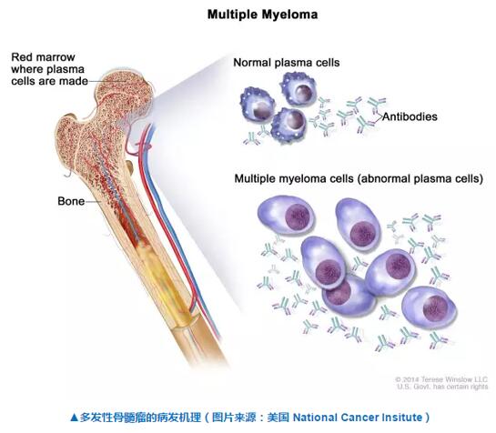 多发性骨髓瘤是一种目前还不可治愈的血癌,其病因发源于骨髓开始,表现为浆细胞的过量增殖以及对骨骼的侵蚀。在中国,多发性骨髓瘤的发病率在十万分之一到十万分之二之间,多为60岁以上的老年人,为发病率第二的血液癌症。在美国,多发性骨髓瘤也是第三大常见的血液癌症,仅次于白血病和淋巴瘤。据估计,在全球范围内,每年有12万多新增病例,并有近9万人死于该疾病。大多数患者经诊断时,往往有贫血、骨痛、肾功能不全、感染、高钙血症等严重症状。