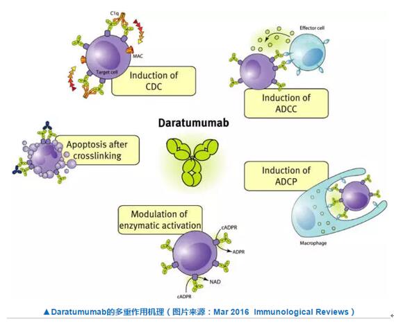 Daratumumab是目前为数不多的多发性骨髓瘤治疗药物,其已于去年11月被美国FDA加速批准,它同时也是首个被美国FDA批准的多发性骨髓瘤单抗药物,其活性成分是一种人源化的抗CD38 IgG1k单克隆抗体。CD38高表达于多发性骨髓瘤细胞的表面, daratumumab可靶向结合CD38分子,激发起一系列免疫反应以攻击癌细胞,通过多种免疫介导及其它作用机制导致诱导癌细胞的凋亡。