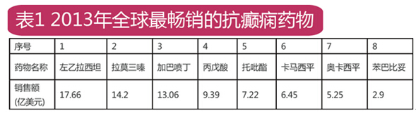 癫痫的治疗包括药物治疗、手术治疗、物理治疗和心理治疗等。其中药物治疗是最常用,因癫痫病程长,治疗周期长,抗癫痫药物临床需求越来越大。2008年全球抗癫痫处方药市场销售规模为167.92亿美元,占全球药品市场年度销售规模的2.15%。近年来,受金融危机及三大最畅销抗癫痫药物左乙拉西坦、托吡酯和拉莫三嗪专利保护期的影响,抗癫痫处方药市场规模有所下降。来自IMS数据显示,2013年全球最畅销的抗癫痫药物(AEDs)详见表1。