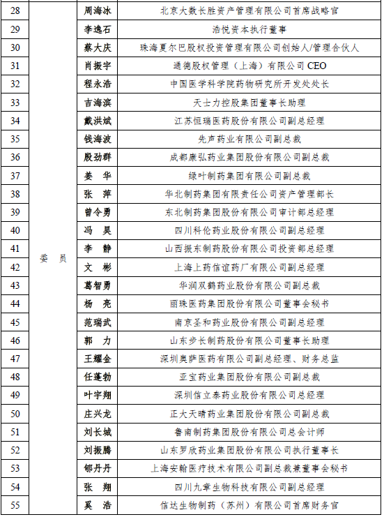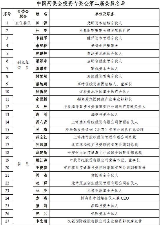 根据《中国医药创新促进会专业委员会管理办法》的相关规定,会议审议通过了投资专委会第二届委员名单(68人),并选举出主任委员1人、副主任委员10人。元明资本创始合伙人田源当选为投资专委会第二届主任委员;再鼎医药董事长兼首席执行官杜莹、醴泽资本管理合伙人李凯军、倚锋创投董事长朱晋桥、博远资本创始合伙人陈鹏辉、启明创投主管合伙人梁颖宇、高瓴资本合伙人易诺青、海捷投资首席合伙人储慧斌、高特佳投资集团创始人、董事长蔡达建、红杉资本中国基金医疗合伙人陆潇波和招商局集团健康产业事业部部长余世新当选为投资专委会第二届副主任委员(投资专委会第二届委员名单附后)。