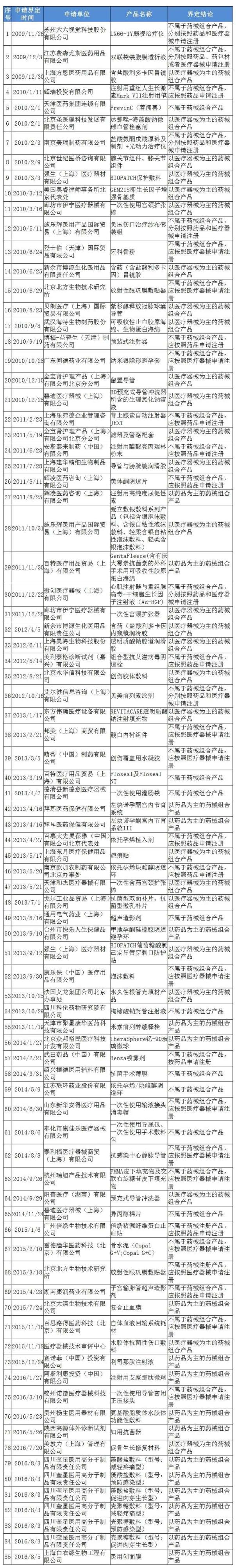 2月13日,CFDA官网发布了《关于药械组合产品属性界定结果的公告》,将2009年以来的药械组合产品属性界定结果予以公告(形成界定意见的有85件,获得批准上市的有4件),旨在引导申请人合理申报。