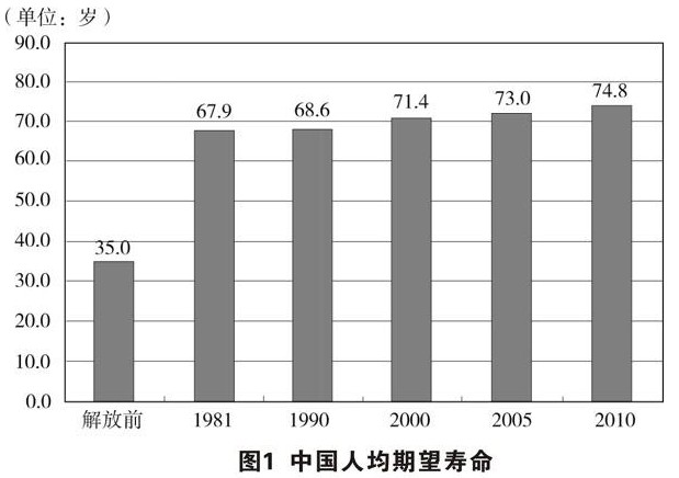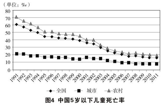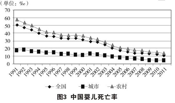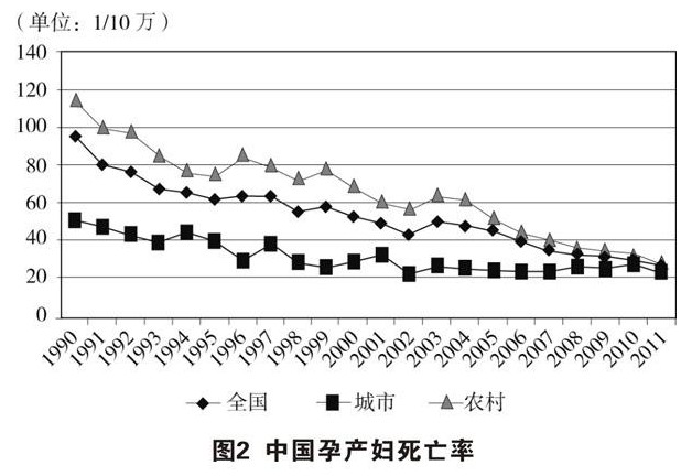 居民健康状况不断改善。从反映国民健康状况的重要指标看,中国居民的健康水平已处于发展中国家前列。2010年人均期望寿命达到74.8岁,其中男性72.4岁,女性77.4岁(见图1)。孕产妇死亡率从2002年的51.3/10万下降到2011年的26.1/10万(见图2)。婴儿死亡率及5岁以下儿童死亡率持续下降,婴儿死亡率从2002年的29.2‰下降到2011年的12.1‰(见图3),5岁以下儿童死亡率从2002年的34.9‰下降到2011年的15.6‰(见图4),提前实现联合国千年发展目标。