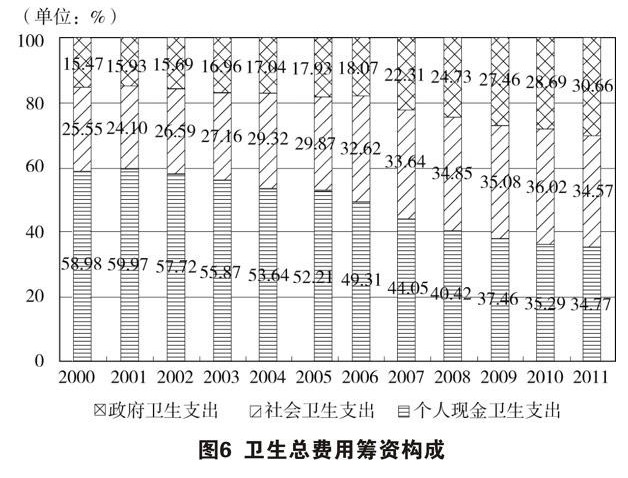 卫生筹资结构不断优化。卫生筹资来源包括政府一般税收、社会医疗保险、商业健康保险和居民自费等多种渠道。2011年,中国卫生总费用达24345.91亿元人民币,同期人均卫生总费用为1806.95元人民币,卫生总费用占国内生产总值的比重为5.1%(见图5)。按可比价格计算,1978—2011年,中国卫生总费用年平均增长速度为11.32%。个人现金卫生支出由2002年的57.7%下降到2011年的34.8%(见图6),卫生筹资系统的风险保护水平和再分配作用不断提高。2011年,医院、门诊机构费用为18089.4亿元人民币,公共卫生机构费用为2040.67亿元人民币,分别占卫生总费用的71.74%和8.09%。医院费用中,城市医院、县医院、社区卫生服务中心、乡镇卫生院费用分别占64.13%、21.28%、5.17%、9.3%。