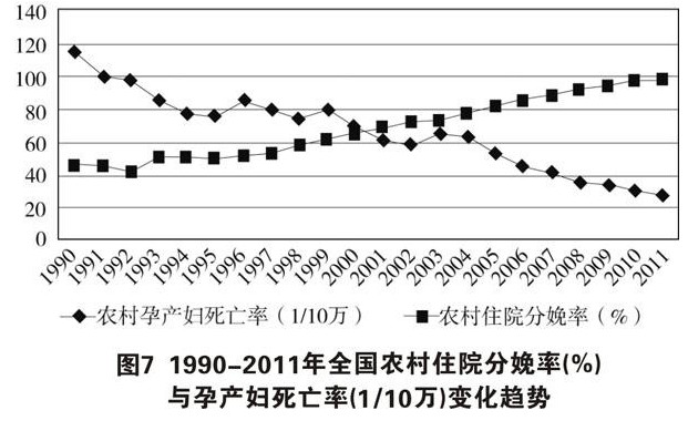 ——基本公共卫生服务均等化水平明显提高。国家免费向全体居民提供国家基本公共卫生服务包,包括建立居民健康档案、健康教育、预防接种、0—6岁儿童健康管理、孕产妇健康管理、老年人健康管理、高血压和II型糖尿病患者健康管理、重性精神疾病患者管理、传染病及突发公共卫生事件报告和处理、卫生监督协管等10类41项服务。针对特殊疾病、重点人群和特殊地区,国家实施重大公共卫生服务项目,对农村孕产妇住院分娩补助、15岁以下人群补种乙肝疫苗、消除燃煤型氟中毒危害、农村妇女孕前和孕早期补服叶酸、无害化卫生厕所建设、贫困白内障患者复明、农村适龄妇女宫颈癌和乳腺癌检查、预防艾滋病母婴传播等,由政府组织进行直接干预。2011年,国家免疫规划疫苗接种率总体达到90%以上,全国住院分娩率达到98.7%,其中农村住院分娩率达到98.1%,农村孕产妇死亡率呈逐步下降趋势(见图7)。农村自来水普及率和卫生厕所普及率分别达到72.1%和69.2%。2009年启动“百万贫困白内障患者复明工程”,截至2011年,由政府提供补助为109万多名贫困白内障患者实施了复明手术。