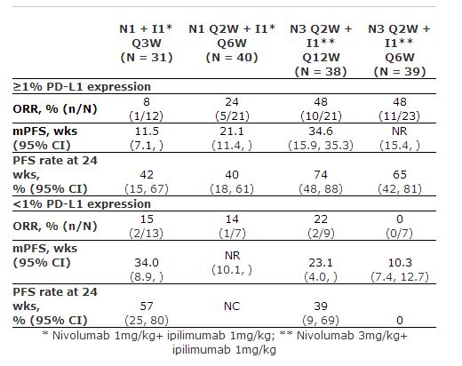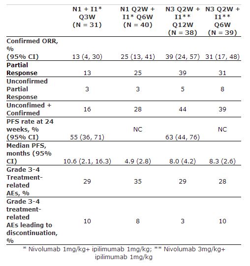 CheckMate-012研究中Opdivo+Yervoy给药方案的疗效和安全性数据如下表: