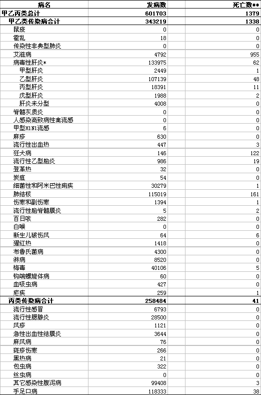 *病毒性肝炎发病数和死亡数分别为甲肝、乙肝、丙肝、戊肝、未分型肝炎报告发病数和死亡数的合计。
