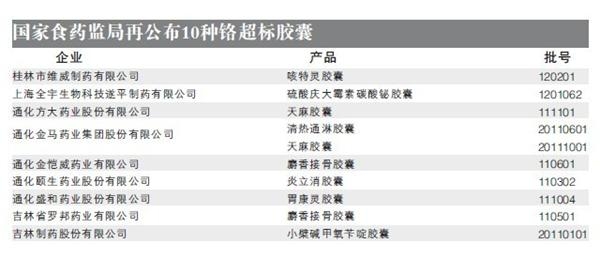 根据中国食品药品检定研究院和省食品药品检验机构检验报告,标示为桂林市维威制药有限公司的咳特灵胶囊(产品批号120201)、上海全宇生物科技遂平制药有限公司的硫酸庆大霉素碳酸铋胶囊(产品批号1201062)、通化方大药业股份有限公司的天麻胶囊(产品批号111101)、通化金马药业集团股份有限公司的清热通淋胶囊(产品批号20110601)和天麻胶囊(产品批号20111001)、通化金恺威药业有限公司的麝香接骨胶囊(产品批号110601)、通化颐生药业股份有限公司的炎立消胶囊(产品批号110302)、通化盛和药业股份有限公司的胃康灵胶囊(产品批号111004)、吉林省罗邦药业有限公司的麝香接骨胶囊(产品批号110501)、吉林制药股份有限公司的小檗碱甲氧苄啶胶囊(产品批号20110101)所用药用胶囊的铬含量严重超出国家药典标准规定。