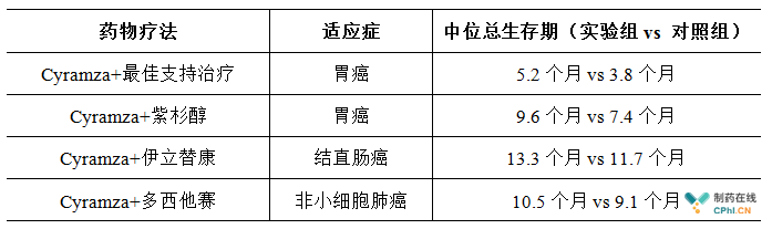 2016年,雷莫芦单抗为礼来公司创造了6.14 亿美元的销售额,同比增长超过了60%。目前,雷莫芦单抗的适应症又增加了结直肠癌和小细胞肺癌。根据礼来公司已经公布的临床试验数据,与对照组相比,雷莫芦单抗用于胃癌、结直肠癌和非小细胞肺癌时能显著改善患者的生存期。