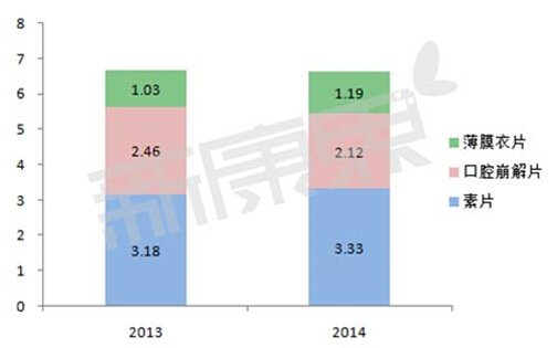 整体而言,除胶囊剂外,2013—2014年阿立哌唑素片和口腔崩解片在总体市场的占比均有所上升,而薄膜衣片的占比则从2013年的36.9%下降为2014年的32%。