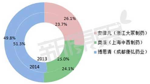 图2 2013—2014年阿立哌唑制剂五大终端市场份额