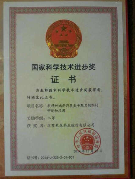1月9日上午,中共中央、国务院在北京人民大会堂举行2014年度国家科学技术奖励大会,党和国家领导人习近平、李克强等出席大会并为获奖代表颁奖。江苏豪森药业作为“抗精神病新药奥氮平及其制剂的研制和应用”项目主要完成单位,荣获2014年度国家科学技术进步二等奖。