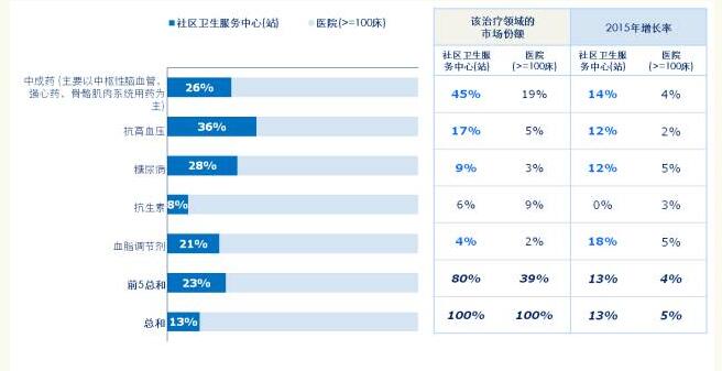 从治疗领域看,一线城市社区用药主要为中成药(以中枢性脑血管,强心药,骨骼肌肉用药为主),高血压,糖尿病和高血脂慢病用药为主,这四大治疗领域约占社区用药销售额的75%,2015年增速均超过12%,远高于医院增速。