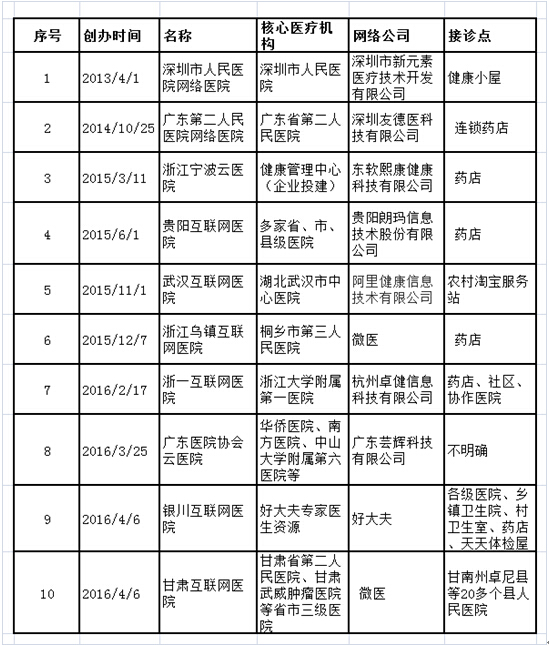 网络医院的起步是从医改前线深圳开始的。按照创建时间排序,包括深圳市人民医院、广东第二人民医院网络医院、浙江宁波云医院、贵阳互联网医院、武汉中心医院互联网医院、浙江乌镇互联网医院、浙一互联网医院、广东医院协会云医院、银川好大夫互联网医院、甘肃互联网医院。