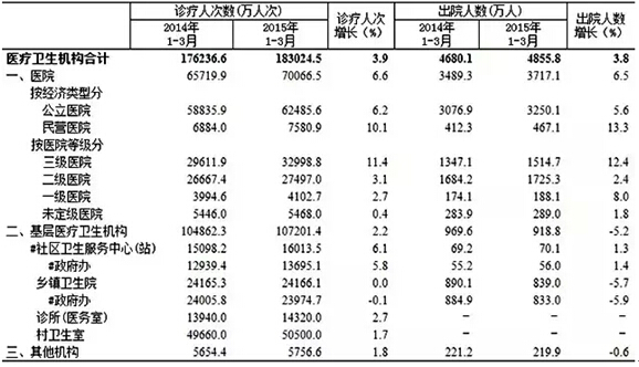 根据国家卫生和计划生育委员会资料显示,2015年一季度全国医疗终端诊疗人次同比提高3.9%,出院人数同比提高3.8%,病床使用率同比降低3%。