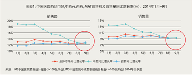 来源:IMS中国医院中成药数据统计报告(≥100张床位),IMS中国县域医院药品统计报告(≥100张床位),3Q2014