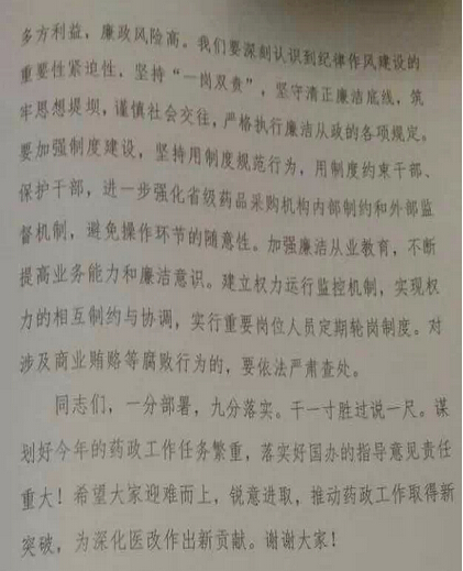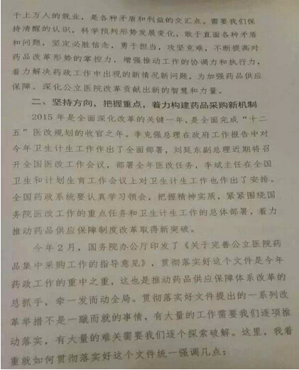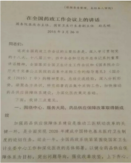 3月26日,2015年全国药政工作会议在京召开,落实国务院2月底发布的《关于完善公立医院药品集中采购工作的指导意见》(也就是国务院7号文此次会议主要议题。国务院医改办主任卫计委副主任、国务院医改办主任孙志刚就此进行了论述。