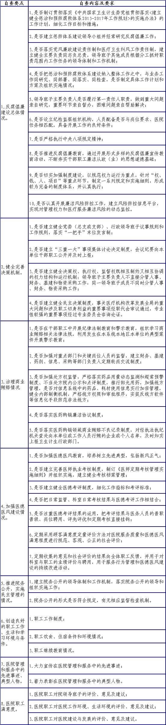 (一)医院自查。总结医院在反腐倡廉建设、落实医疗卫生行风建设“九不准”、医院管理、经济管理等方面的工作,重点查找不足,并按照要求提前准备和提交相关材料(自查表见附件2)。