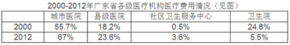 习总书记最近考察了浙江省镇江市的基层医疗机构,发出了一段感叹,语言简单,寓意非常。他说:“人民群众对医疗服务均等化愿望十分迫切。像大城市的一些大医院,始终处于‘战时状态’,人满为患,要切实解决好这个问题。”我们也注意到:北京急诊量近10年增加了4~5倍。可是北京真的有这么多人需要急诊吗?专家认为,7成患者非要急诊。再看看我国2011年卫生费用的流向,其中城市医院占40%,县医院占13%,卫生院占6%,社区卫生服务中心占3%。可见,医疗卫生资源利用和患者就医向高级医疗机构集中的状况尚未得到根本改变。或许广东12年来医疗费用的变化可以回答习总书记提出的问题: