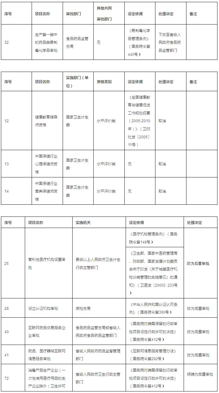 国务院关于取消和调整一批行政审批项目中涉及医疗领域的明细: