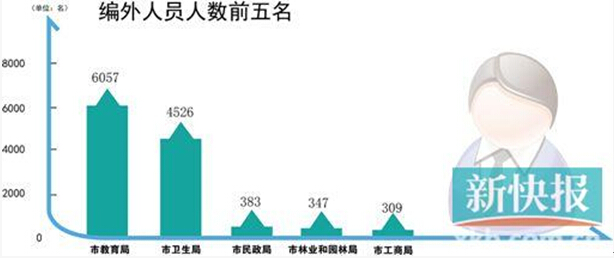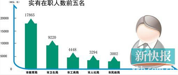 新快报记者统计的97个部门中,有94个部门公布了实有在职人数(市公安局、市委宣传部未公布,市侨联网页无法打开)。结果显示,全市实有在职人数合计62798人(其中行政编制12775人,事业编制48399人,另有工勤等编制未统计);编外人员14383人。