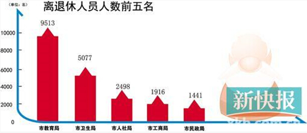 统计还显示,上述94个部门共有离退休人员33772人,其中离休934人,退休32655人。值得注意的是,同时公布离退休人员总数和实有在职人数的部门中,有11个部门的离退休人员是大于实有在职人数(编制外人员未包含在内)。其中,比例最高的市旅游局实有在职人数94人,但离退休人员有152人,离退休人员与实有在职人数的比例为1.62。