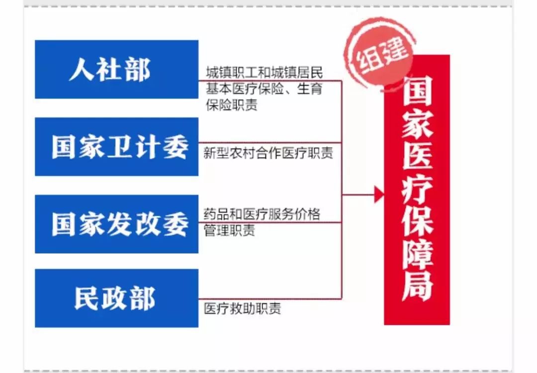 按调整方案,将人力资源和社会保障部的城镇职工和城镇居民基本医疗保险、生育保险职责,国家卫生和计划生育委员会的新型农村合作医疗职责,国家发展和改革委员会的药品和医疗服务价格管理职责,民政部的医疗救助职责整合,组建国家医疗保障局,作为国务院直属机构。