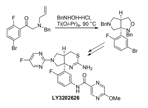 通过早期先导化合物活性研究,礼来的研究人员发现LY3202626具有高效的BACE1酶抑制活性,因此极具临床治疗AD症的潜在应用价值。第一代合成路线(图1)从多取代的碘苯化合物4开始,经碘锂交换后再对Weinreb酰胺5进行加成,随后通过肟和碳碳双键的[3+2]环加成反应构筑[5,5]并环。胺基对异硫氰酸酯的加成引入硫脲结构,再通过Mitsunobu反应关环得到噻嗪环结构。目标分子中,关键的苯胺结构是通过Cu催化溴苯和叠氮化钠交叉偶联反应实现的,最终该路线能够获得毫克级的目标产品LY3202626。