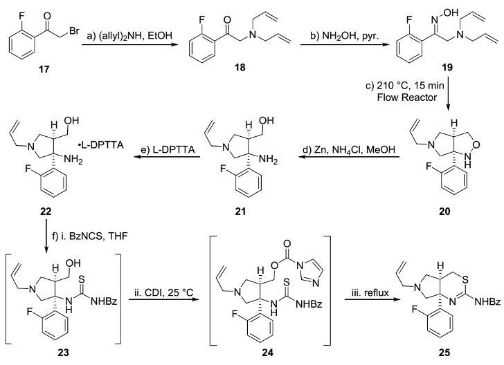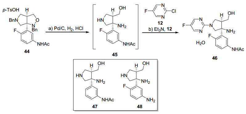 值得一提的是,在如何得到光学纯产品的问题上,与前两代合成路线相比,第三代合成路线进展显著。第一代路线使用了昂贵的手性超临界流体色谱拆分法;第二代路线尝试手性羟胺进行环加成,但手性诱导效果不佳且后续进行N-O键断裂时存在更多问题,最终采用二对甲基苯甲酰酒石酸(L-DPTTA)进行包结拆分的方法,以38%收率、98%ee获得产物。而在第三代路线则使用更为廉价的D-扁桃酸对关环产物42进行拆分,能够以40%的收率、99.5%的ee值得到光学纯化合物,在几条不同路线中效率最高、成本最低。