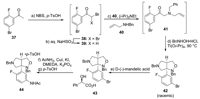 第三代合成工艺首先使用NBS对苯乙酮类化合物37的羰基进行邻位溴代,并通过亚硫酸氢钠水溶液处理的操作获得单溴代产物39。与第二代合成路线相比,该路线的亮点之一在于使用肟进行硝酮[3+2]环加成反应时,将反应温度从210 °C降至90°C,极大地改善了反应的可操作性,同时由于反应条件更加温和,反应的副产物也大大减少,最终收率由40%提高到75%。