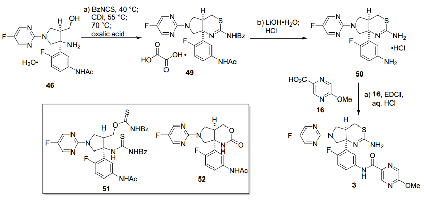第三代合成工艺中,苯环上F取代基对位的胺基则是通过CuI催化Buchwald类型的交叉偶联反应引入的,这一操作可避免使用剧毒叠氮化物,进行强酸硝基化反应,具有明显的优势。Pd/C氢化脱苄基时,会有副产物47和48生成,通过优化操作工艺可将氢化反应条件变为酸性,从而避免生成脱F的副产物47,而副产物48则可通过重结晶除去。在进行噻嗪环关环时精确控制BzNCS的用量,可避免因用量过多或过少而产生副产物。随后使用LiOH将苯甲酰基和乙酰基一锅法解离得到化合物50,再进行酰化反应,最终实现高效大规模制备目标产物LY3202626。