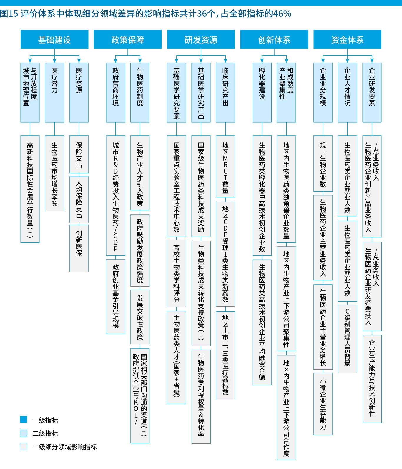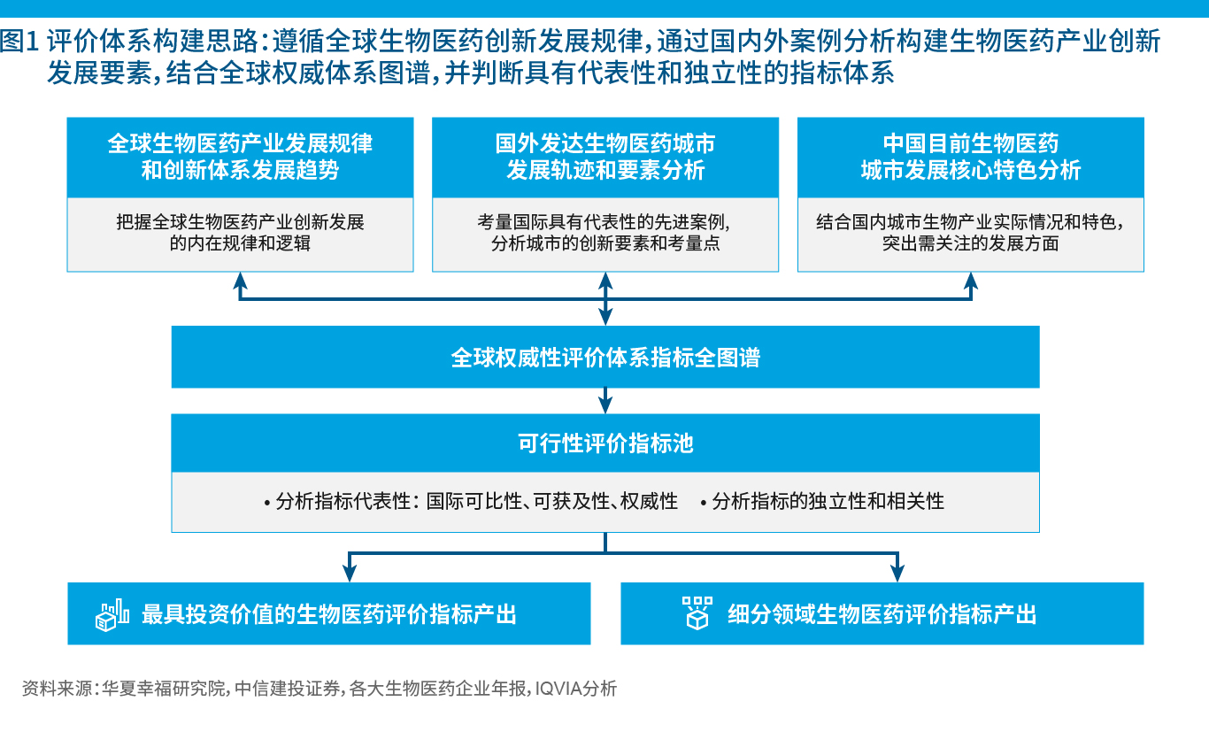 评价体系构建思路主要从两个方面出发,一是遵循全球生物医药创新发展规律,同时以国外生物医药产业领先城市作为研究学习案例,并进一步研究我国现有生物医药产业发展领先城市的经验;二是融合全球权威评价体系图谱,并判断具有代表性和独立性的指标体系,通过两方面的结合最终构建本项目中国生物医药城市评价体系。在生物医药细分领域方面,将通过细分领域指标数据分析,体现不同城市在生物医药领域的差异性。