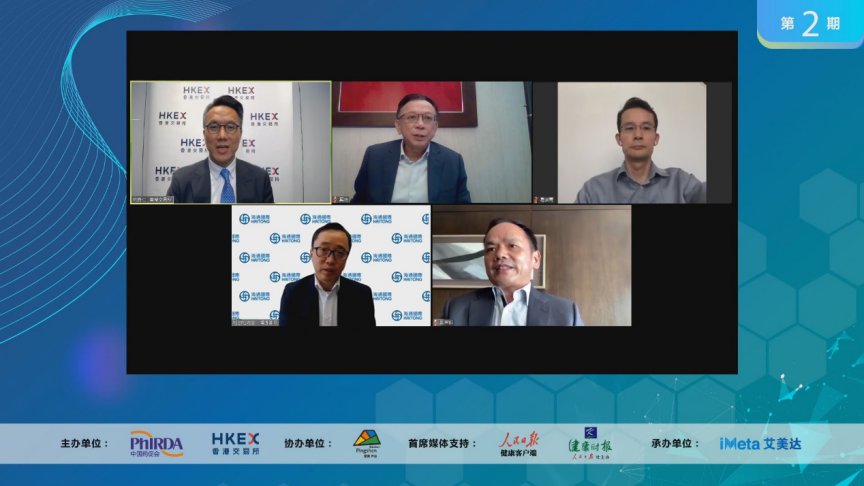 (左上:香港交易所董事总经理、市场主管 姚嘉仁,中上:信达生物首席财务官 奚浩,右上:高瓴资本集团合伙人、联系首席投资官 易诺青,左下:海通国际执行委员会委员、首席营运官 杜劲松,右下:摩根士丹利中国医疗行业研究团队主管 吴声积)