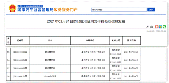 2021年3月31日,据国家药品监督管理局网站显示,治疗胃肠道间质瘤(GIST)药物阿伐替尼(商品名:泰吉华,曾用名:阿泊替尼)和瑞派替尼(商品名:擎乐,英文名:Ripretinib)已在我国获批上市。