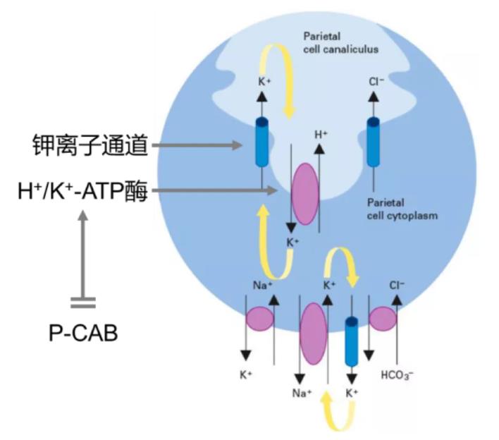 为了克服酸相关性疾病上述未满足临床的需求,开发常规PPI替代制剂和新型H-K-ATP酶抑制剂尤为必要。P-CAB是全新机制的新一代抑酸药物,其以钾离子竞争性的方式可逆性地抑制胃壁细胞上的H+、K+-ATP酶,是一种可逆性K+拮抗剂,具有起效迅速、抑酸作用强且持久、不良反应少等优点。与PPI相比,P-CAB具有起效快,持久和可逆抑制胃H-K-ATP酶的作用。