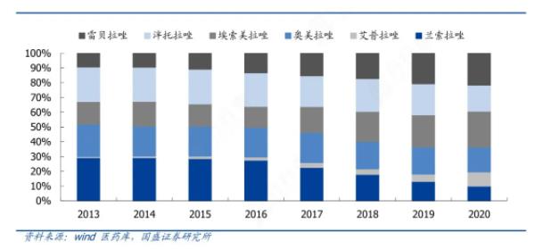 国内已上市的艾司奥美拉唑((又称埃索美拉唑)、雷贝拉唑、泮托拉唑、奥美拉唑、兰索拉唑和艾普拉唑等6个质子泵抑制剂品种占据了消化性溃疡用药80%以上的市场,近几年市场占比变化明显:奥美拉唑、兰索拉唑、泮托拉唑等市场快速下降,艾司奥美拉唑、雷贝拉唑、艾普拉唑迅速崛起。