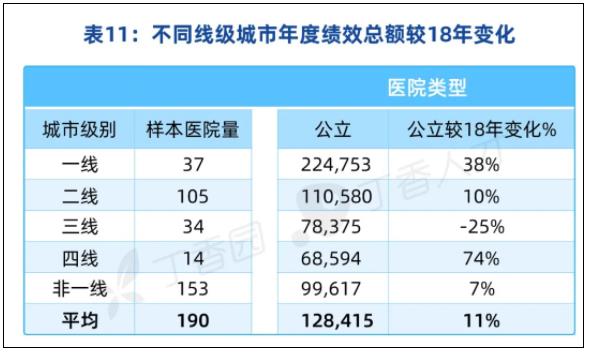 由于马太效应导致人口与资源向一线城市集中,相应病患、学术、重大项目等资源向高层级城市聚集,一线城市公立医院的绩效收入较 2018 年增长 38%。三线城市则由于人口外流和医疗资源集中在大城市带来的病人流失,绩效收入较 2018 年下降 25%。