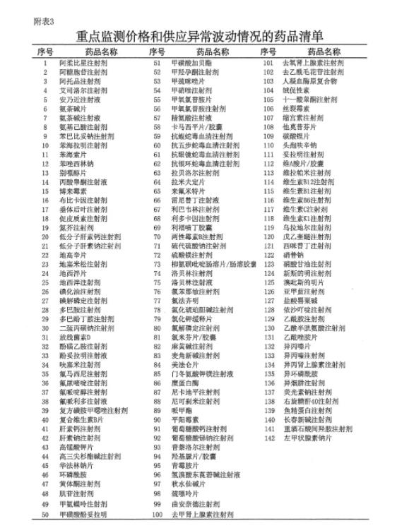 在通知中,国家医保局表示,决定依托省级药品集中采购平台,试行药品价格与供应异常变动监测。 针对药品价格与供应异常变动监测,主要是为了服务医疗卫生机构有序开展诊疗用药,维持药品采购正常价格秩序和药品及时配送供应,准确掌握药品采购价格与供应异常变动情况,了解异常变动原因,为应对药品价格与供应异常变动情况提供信息支撑,为科学决策提供依据。 根据国家医保局的要求,省级药品集中采购平台将挂网交易的所有药品列入常规监测范围,并对部分临床反映集中的药品进行重点监测。 在附表3中,国家医保局划定了一份涉及142个品种的“重点监测价格和供应异常波动情况的药品清单”,涉及——阿柔比星注射剂、阿糖胞苷注射剂、阿托品注射剂、氨茶碱片、别嘌醇片、低分子肝素钠注射剂、地高辛片、地西泮片、地塞米松注射剂、多巴胺注射剂、环磷酰胺、肌苷注射剂、甲氨蝶呤注射剂、雷尼替丁注射剂、利巴韦林注射剂、利多卡因注射剂、去甲肾上腺素注射剂、丝裂霉素、鱼精蛋白注射剂、长春新碱注射剂、重酒石酸间羟胺注射剂等常见的容易出现临床短缺的药品。