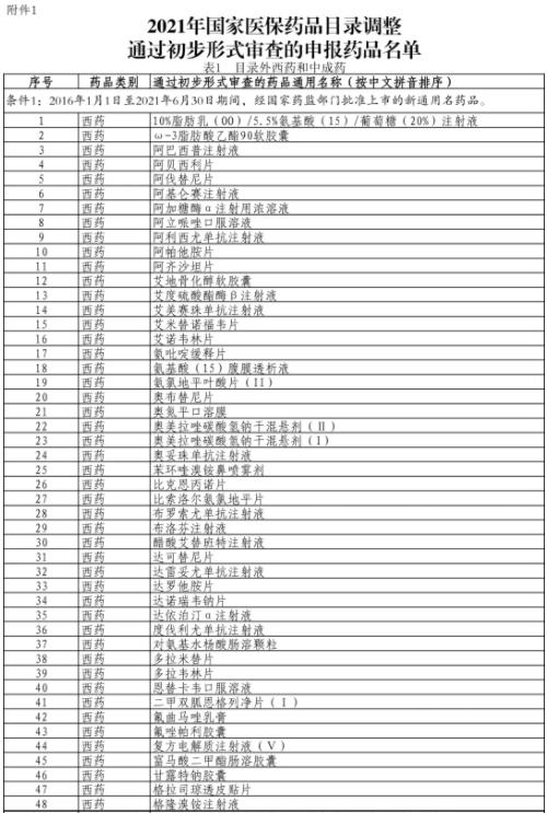 附:2021年国家医保药品目录调整通过初步形式审查的申报药品名单