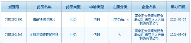 8月3日,南京正大天晴提交了磷酸特地唑胺片的4类仿制上市,该申请获得CDE承办。早在今年6月,该公司已顺利提交了注射用磷酸特地唑胺的4类仿制上市申请,目前相关受理号正在审评审批中。