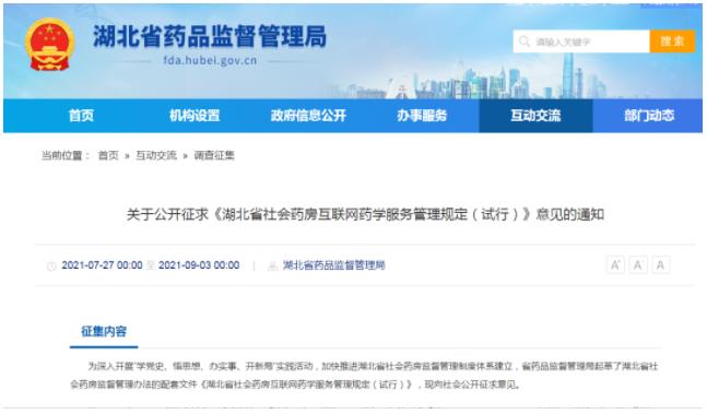 近日,湖北省药监局起草公布了《湖北省社会药房互联网药学服务管理规定(试行)》(以下简称《规定》),向社会公开征求意见。湖北药监局表示,《规定》的出台旨在创新药学服务模式,规范社会药房互联网药学服务管理,助力健康湖北建设。
