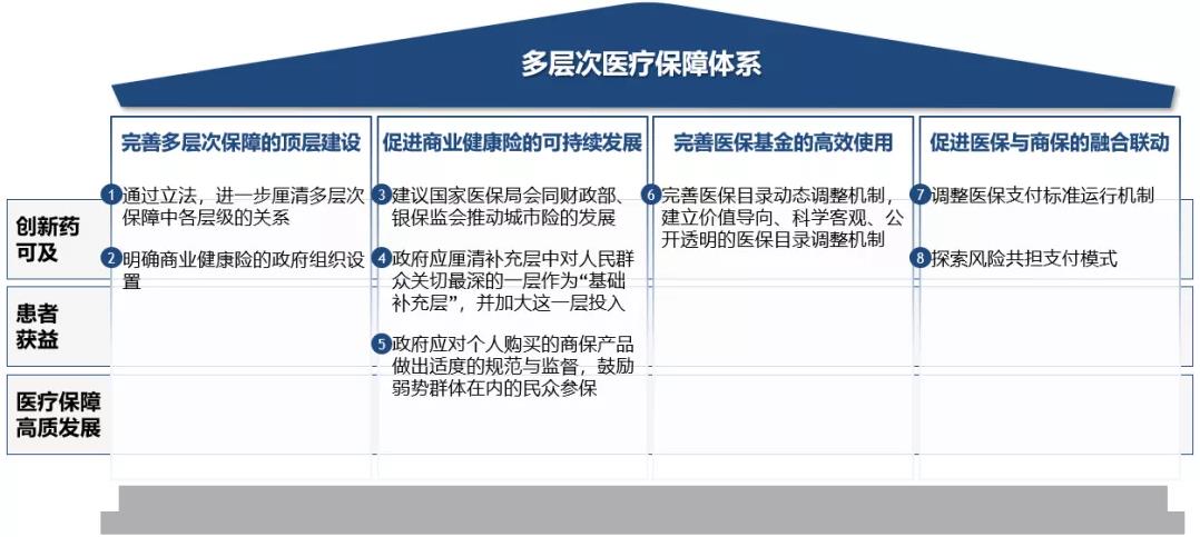 今日,PhIRDA联合RDPAC重磅发布《多层次医疗保障体系助力人民健康和产业高质量发展》是《构建中国医药创新生态系统》系列报告的第三篇,旨在从我国医疗保障体系和创新药支付体系的现状和挑战出发,借鉴德国、美国、法国、澳大利亚等多个国家多层次医疗保障体系的建设和发展的成熟经验,以完善中国多层次医疗保障体系建设、保护人民群众健康,同时推动创新医药产业高质量协同发展为目标,从完善多层次保障的顶层建设、促进商业健康险的可持续发展、完善医保基金的高效使用、促进医保与商保的融合联动等角度提出具体建议(如下图)。