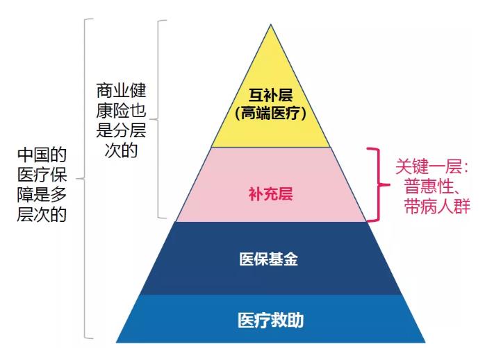 首先,从需求层次来看,尽管商业健康险的保障层次也体现了“多元化”的特征,但均涵盖了 “补充型”的功能。报告研究显示,我国群众对商保有三大类需求,包括自付补充(对医保内的服务或产品自付部分的报销)、医保外补充(医保不覆盖的产品或服务补充)和互补型商保(在医保覆盖范围内,但患者可能选择非医保定点的医疗服务机构就医)。其中,医保外的补充需求是现阶段人民未被满足的医疗基本需求,也是商业保险短期需要重点建设和覆盖一个层次。