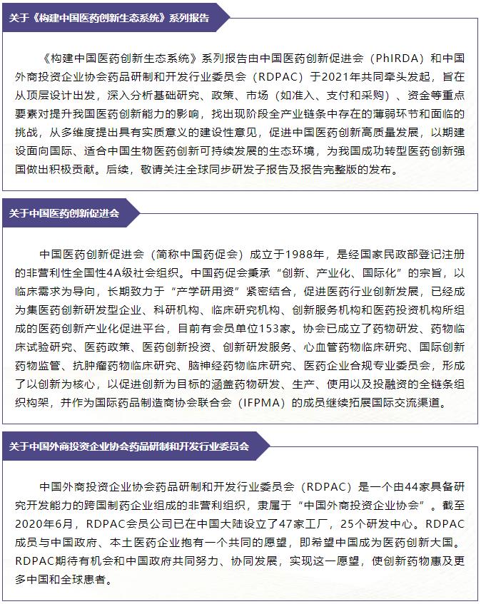 围绕“十四五”时期的“坚持创新驱动发展”战略要求,中国医药创新促进会(PhIRDA或中国药促会)联合中国外商投资企业协会药品研制和开发行业委员会(RDPAC)于今年初开始,联合推出《构建中国医药创新生态系统》系列报告,旨在沿着“创新产业竞争力”、“创新药物可及”和“创新医药产业可持续”三条主线对我国创新医药生态系统的长期发展提出多维度的建设性意见,以促进中国医药创新高质量发展,目前已发布《2015-2020年发展回顾及未来展望》和《推动基础研究,激活源头创新》两个子报告。