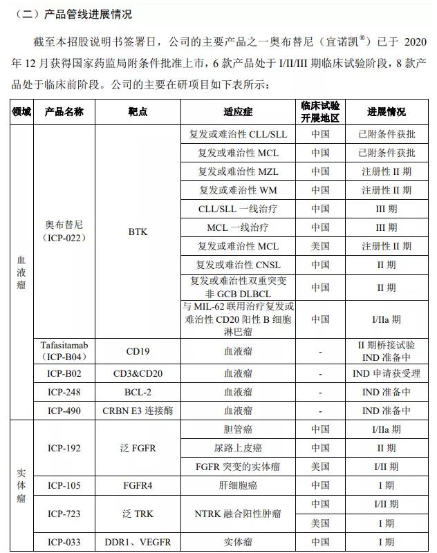 在具有丰富研发、生产和商业化经验的管理团队的带领下,公司已构建起一体化的 生物医药平台,兼顾研发质量与研发速度的需求,建立了创新性与风险高度平衡、涵盖 多个极具市场前景的热门靶点的产品管线,正加速成长为为全世界肿瘤和自身免疫性疾 病患者开发并提供创新疗法的生物医药领导者。截至本招股说明书签署日,公司的主要 产品之一奥布替尼(宜诺凯®)已于 2020 年 12 月获得国家药监局附条件批准上市,6 款产品处于 I/II/III 期临床试验阶段,8 款产品处于临床前阶段。公司正在以中美两地为 主的全球市场快速推进在研产品的临床试验与注册申报工作,以实现产品管线中的候选 药物早日造福全球患者。